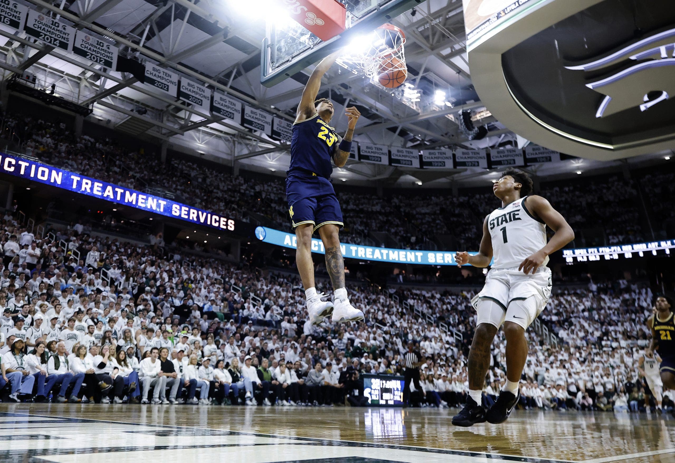 EAST LANSING, MICHIGAN: Yaxel Lendeborg dunks against Michigan State at Breslin Center on January 30, 2026. (Photo by Rey Del Rio/Getty Images)