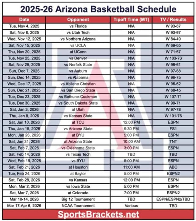 2025-26 Calendario de baloncesto de Arizona Comenzó el 4 de noviembre con una victoria sobre Florida. Aquí están todos los resultados y los próximos partidos del resto de la temporada regular para ti antes del inicio. Torneo de baloncesto masculino Big 12.
