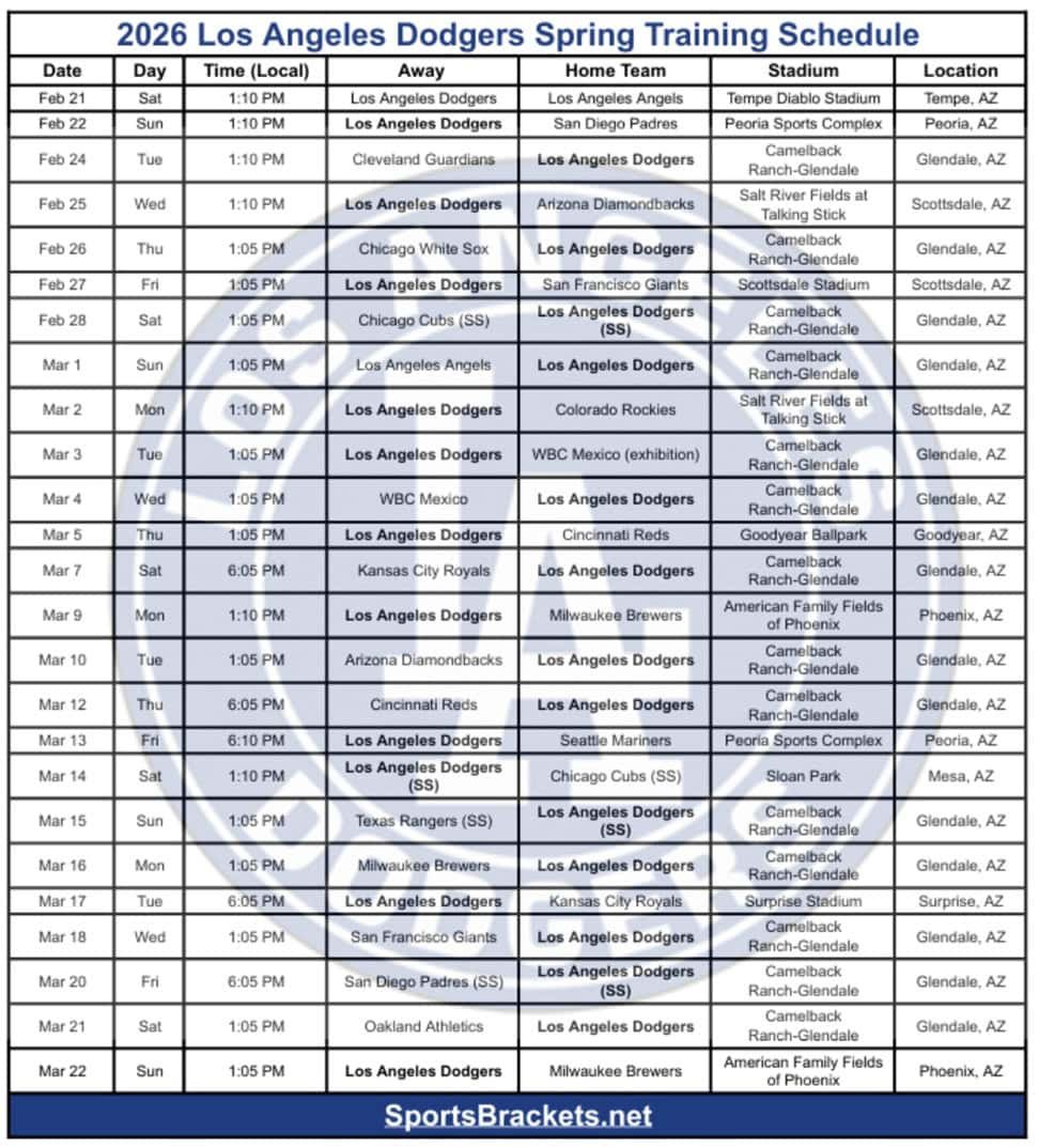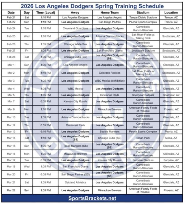 Esto es Calendario de entrenamientos de primavera de Los Angeles Dodgers 2026 para usted en formato de cuadrícula. Todos los horarios son hora local de Arizona (MST/PDT; el horario de verano comienza el 8 de marzo). Juegos en casa en Camelback Farm-Glendale, Glendale, AZ estan dentro atrevido Similar a lo que ves en nuestro otro sitio Calendario de entrenamientos de primavera 2026. Guarde o imprima esta tabla para consultarla fácilmente.