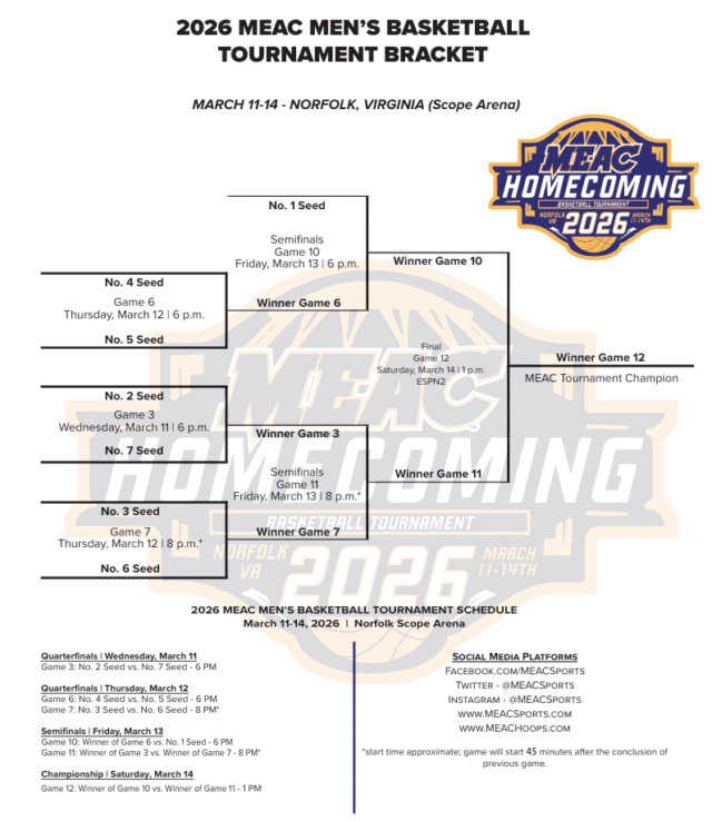 Aquí está el cuadro imprimible del torneo de baloncesto masculino MEAC 2026 para usted. Puedes descargar e imprimir un PDF del torneo. sitio web aquí.