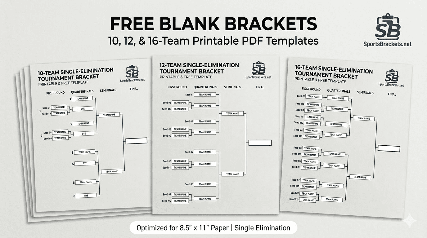 Ya sea que estés organizando un torneo juvenil local, un torneo de balón prisionero o un equipo de oficina personalizado para March Madness, tener un torneo limpio y profesional es esencial. A continuación le proporcionamos mesas de torneos en blanco imprimibles de alta calidad y gratuitas. Las plantillas están disponibles en formatos PDF y de imagen para campos de 10, 12 y 16 equipos. Estos soportes están diseñados para juegos de eliminación simple y están formateados para papel estándar de 8,5 x 11 pulgadas.