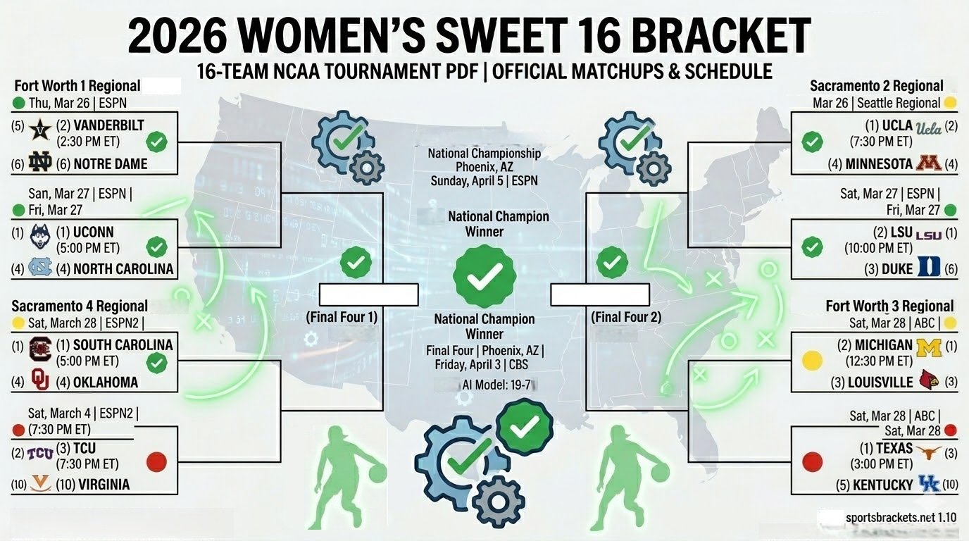 Esto es Calendario de octavos de final femenino 2026 para ti. Nuestro marco actualizado v1.0 refleja con precisión los dos caminos paralelos que definirán el torneo. Aquí está el calendario completo de las semifinales regionales, que se muestra en su PDF imprimible. También puedes consultar el nuestro. Generador de bingo March Madness si buscas darle vida a la diversión de ver los juegos de este fin de semana.