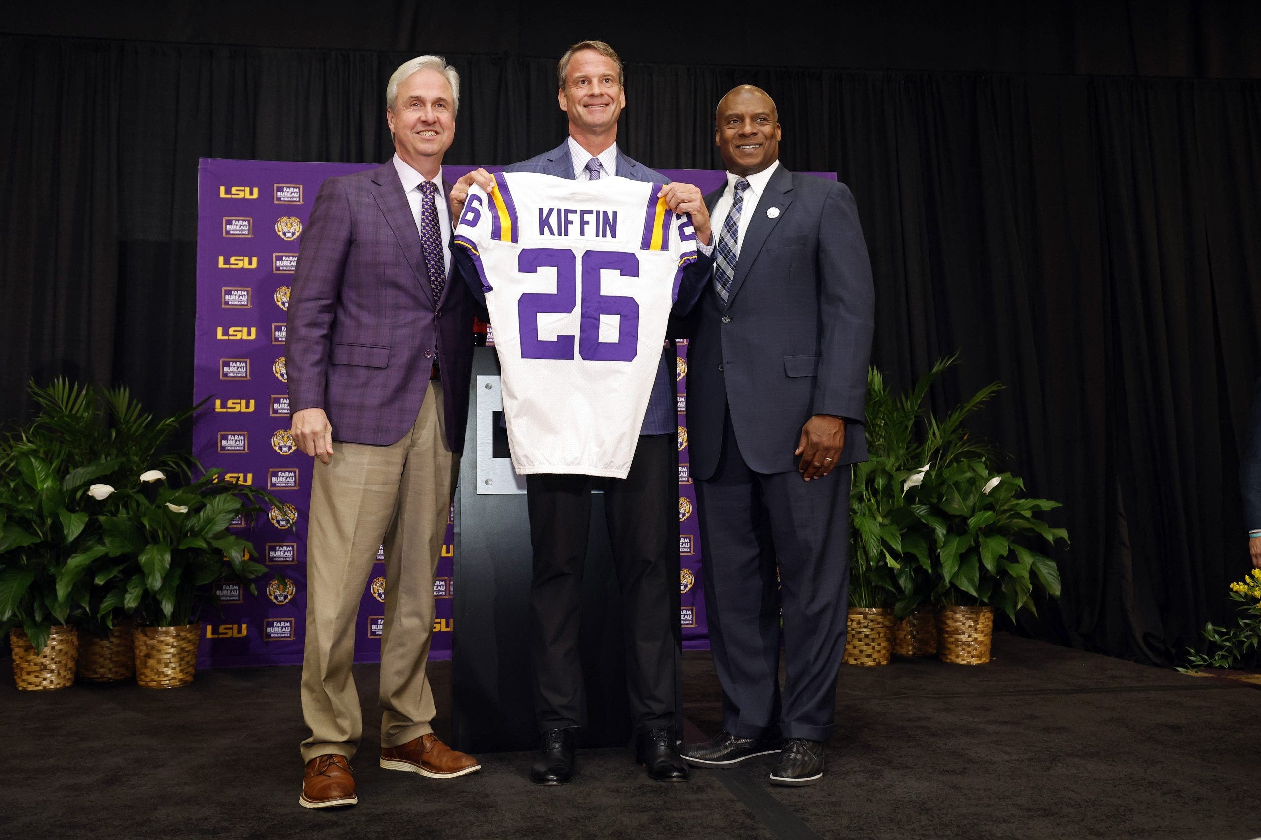 Lane Kiffin poses for a photo as he is introduced as the new head football coach of the LSU Tigers. (Photo by Tyler Kaufman/Getty Images)
