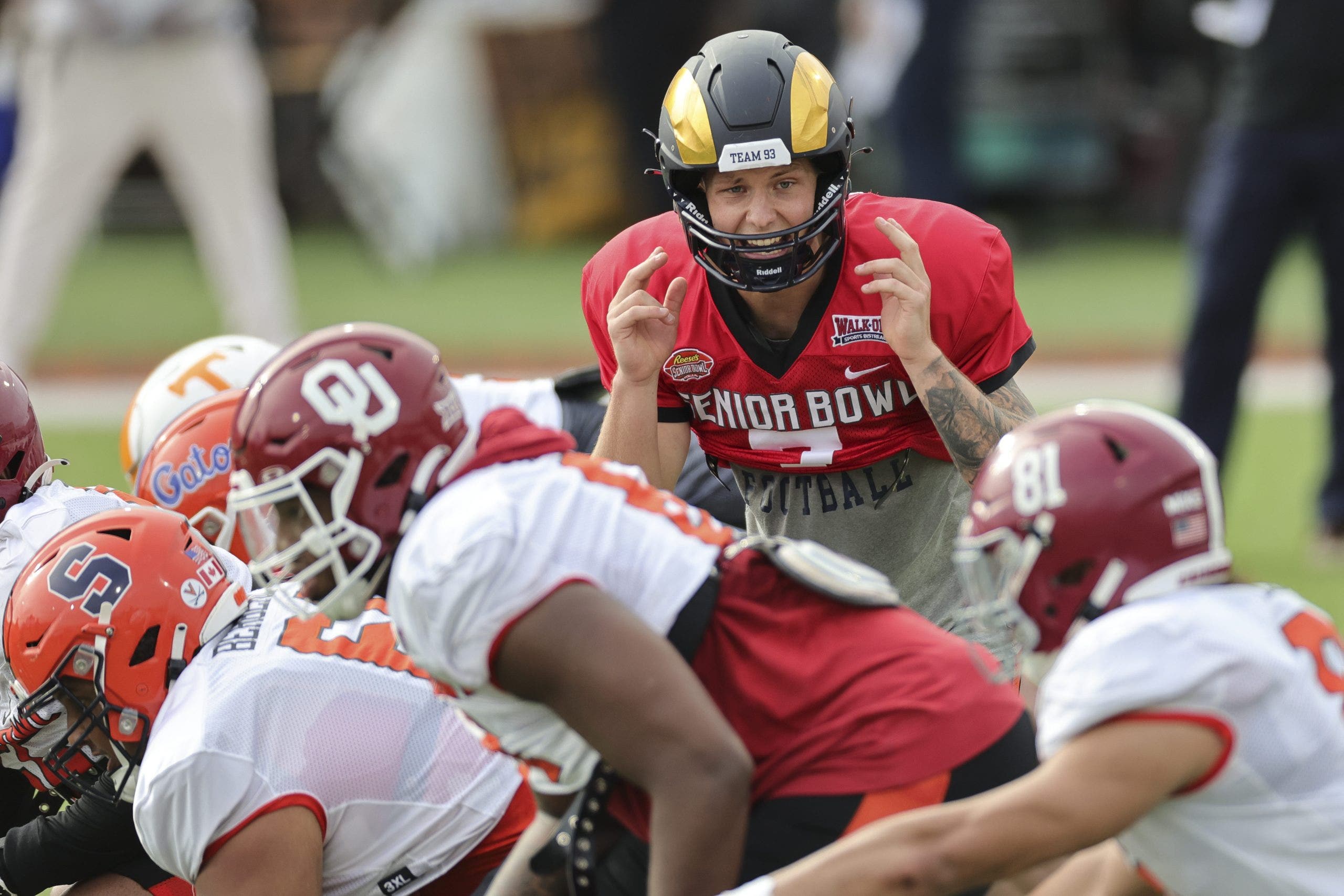 Tyson Bagent of Shepherd (7) audibles at the line during Wednesdays Senior Bowl Practice session.(Photo by Bobby McDuffie/Icon Sportswire via Getty Images)