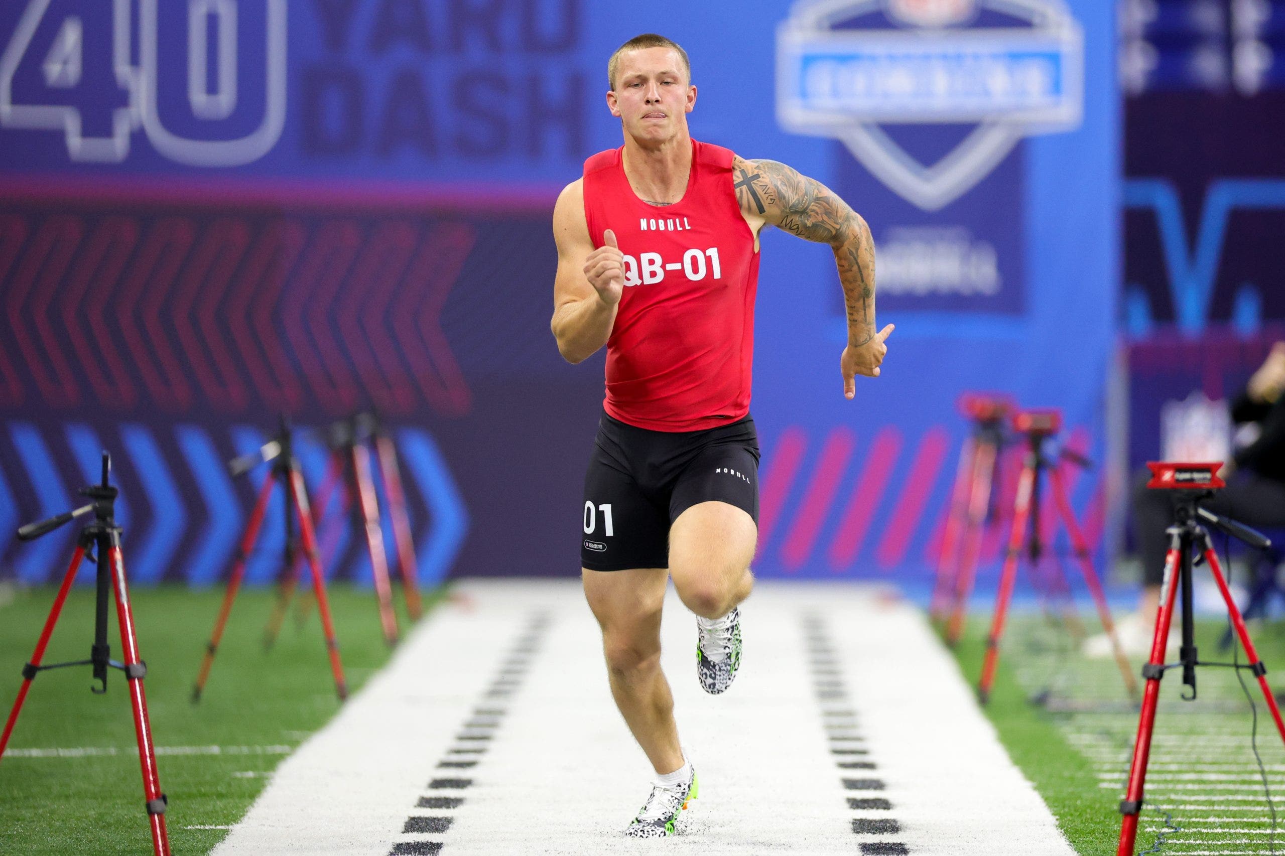 Quarterback Tyson Bagent of Shepherd participates in the 40-yard dash during the NFL Combine at Lucas Oil Stadium on March 04, 2023 in Indianapolis, Indiana. (Photo by Stacy Revere/Getty Images)