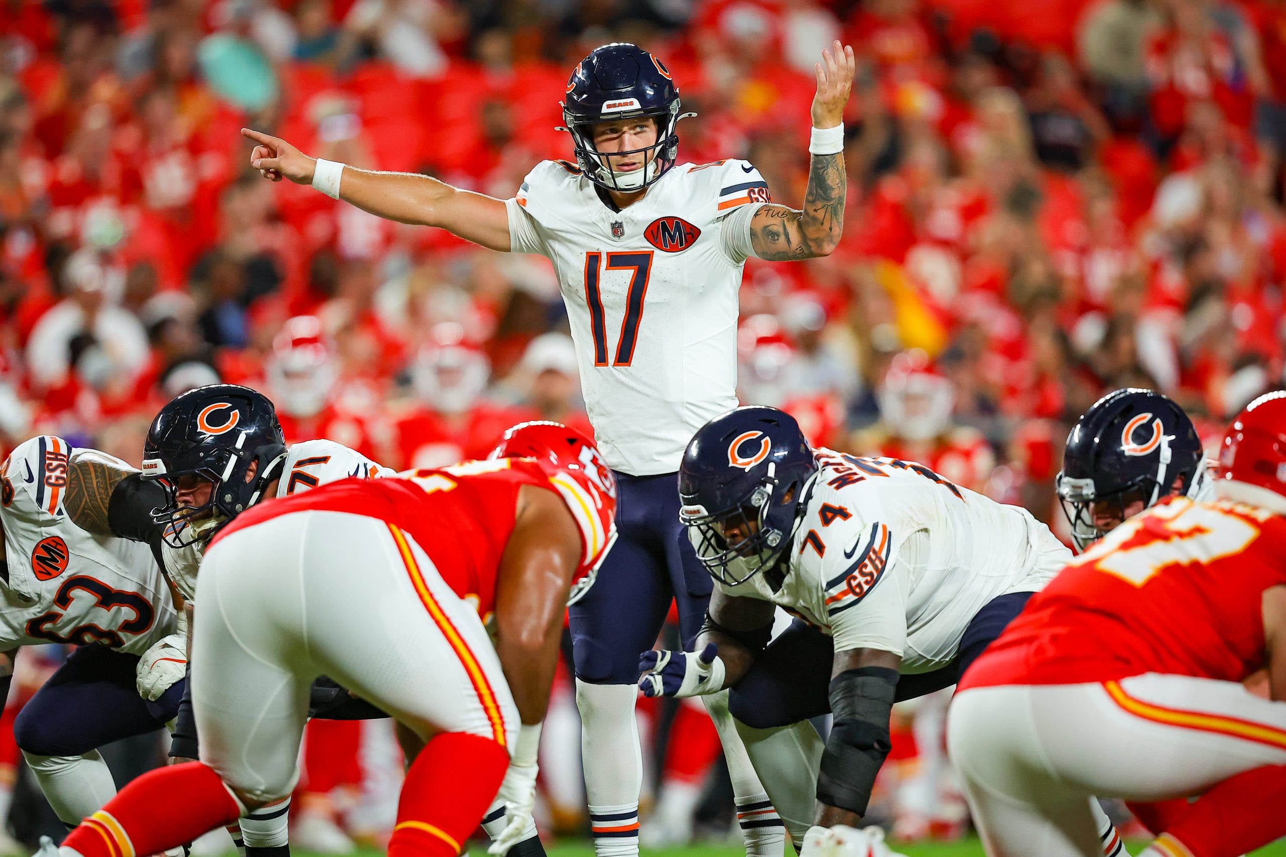 Tyson Bagent motions at the line of scrimmage in the third quarter during the NFL Preseason 2025 game between Chicago Bears and Kansas City Chiefs at Arrowhead Stadium on August 22, 2025 in Kansas City, Missouri. (Photo by David Eulitt/Getty Images)