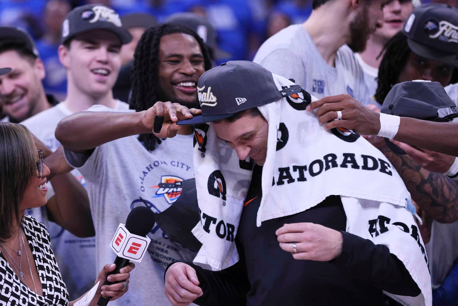 El entrenador en jefe de Oklahoma City Thunder, Mark Daigneault, celebró con su equipo después del partido final de la final de la Conferencia Oeste de la ronda de baloncesto de la NBA Play -FF con Minnesota Timberwolves, el miércoles 28 de mayo de 2025, en Oklahoma. (AP Photo/Nate Billings)