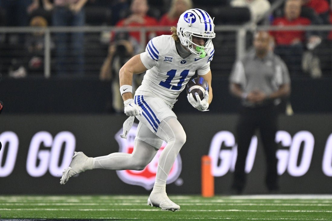 6 de diciembre de 2025; Arlington, Texas, EE.UU.; El receptor de BYU Cougars Parker Kingston (11) corre con el balón durante la primera mitad contra los Texas Tech Red Raiders en el estadio AT&T. Crédito obligatorio: Jerome Miron-Imagn Images