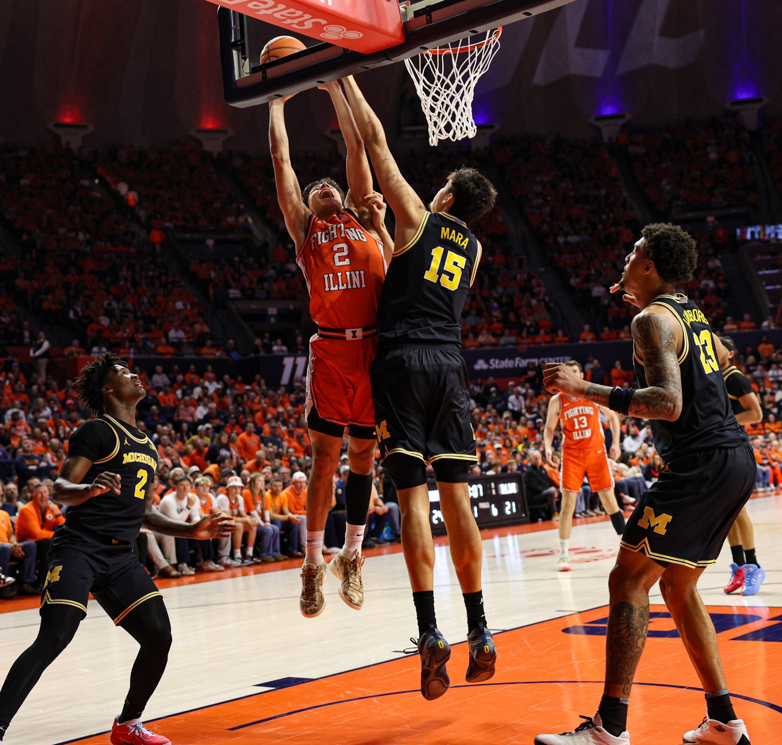 Illinois is the tallest team in the nation, but on Friday, it was the Wolverines’ height and physicality that won the night. Aday Mara, Michigan’s 7-foot-3, 255-pound center, stuffed the stat sheet: 19 points on 8-of-9 shooting, five rebounds, two assists and two blocks, including this one on 6-foot-7 Illinois guard Andrej Stojakovic.