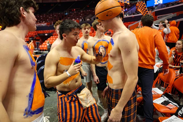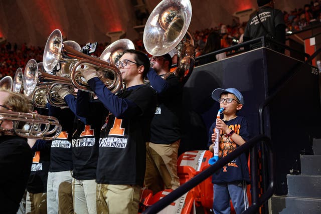 The Illinois band also did its best to pump up the crowd. That included 9-year-old Milo Neal, who plays along at all the big games. He’s such a superfan that a band member made him a miniature uniform just like the one the Marching Illini wear at football games.