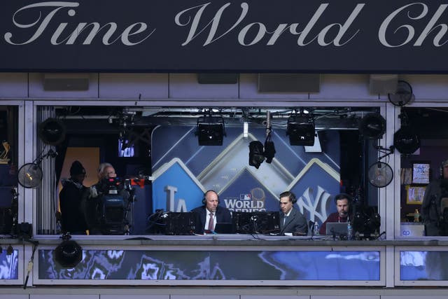 FOX broadcasters John Smoltz and Joe Davis call the 2024 World Series between the New York Yankees and Los Angeles Dodgers. (Photo by Luke Hales/Getty Images)