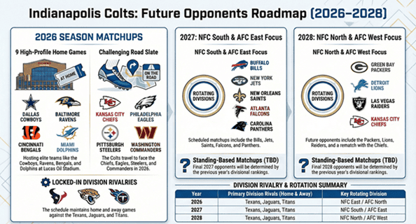 Ahora que la temporada 2025 de la NFL ha terminado, los fanáticos de los Indianapolis Colts ya esperan con ansias los juegos futuros. Tenemos los futuros oponentes y calendarios de los Indianapolis Colts para usted. Gracias a la rotación de calendario fijo de la NFL, conocemos a los oponentes de los Colts en las próximas temporadas. La fórmula garantiza que cada equipo juegue contra sus oponentes de división dos veces (en casa y fuera), divisiones completas de la NFC y la AFC de forma rotativa y juegos interconferencias adicionales basados en las clasificaciones del año anterior.
