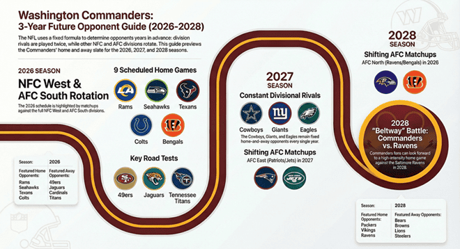 Ahora que la temporada 2025 de la NFL ha terminado, los fanáticos de los Washington Commanders ya esperan con ansias los juegos futuros. Tenemos aquí para usted los oponentes del Comandante Washington y su calendario futuro. Gracias a la constante rotación de calendario de la NFL, conocemos a los oponentes de los Commanders en las próximas temporadas. La fórmula garantiza que cada equipo juegue contra sus oponentes de división dos veces (en casa y fuera), divisiones completas de la NFC y la AFC de forma rotativa y juegos interconferencias adicionales basados en las clasificaciones del año anterior.