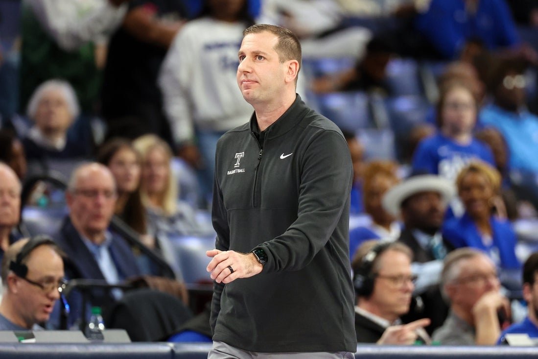 9 de febrero de 2025; Menfis, Tennessee, Estados Unidos; Adam Fisher, entrenador principal de Temple Owls, observa el partido contra los Memphis Tigers durante la primera mitad en FedExForum. Crédito obligatorio: Wesley Hale-Imagn Images