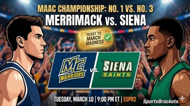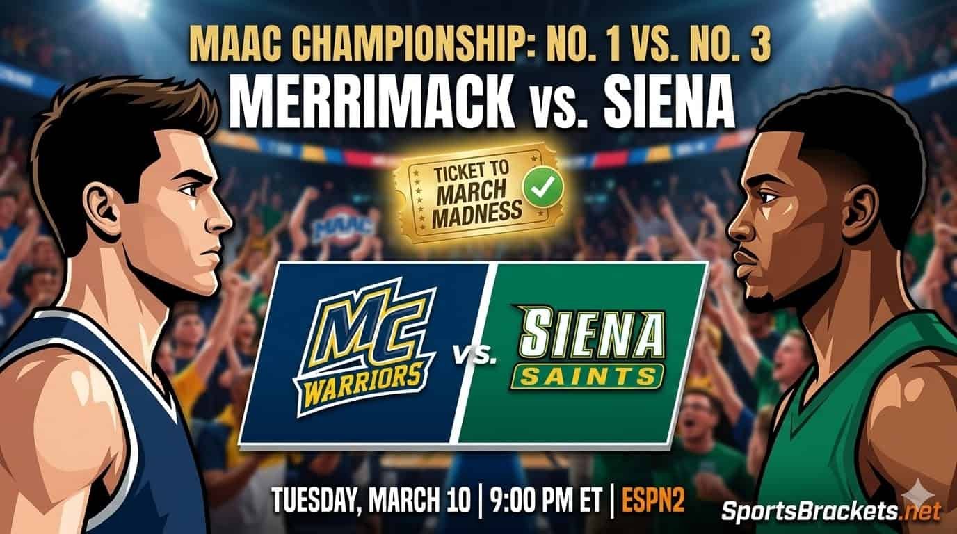 el Campeonato de baloncesto masculino MAAC 2026 medio juego Soldado Merrimack nº 1 y No. 3 Santa Siena tendrá lugar esta noche, 10 de marzo de 2026En 21:00 horas hora del este. El partido será retransmitido en directo por ESPN2 de Atlantic City, Nueva Jersey. El ganador recibirá una oferta automática para el Torneo de la NCAA de 2026.