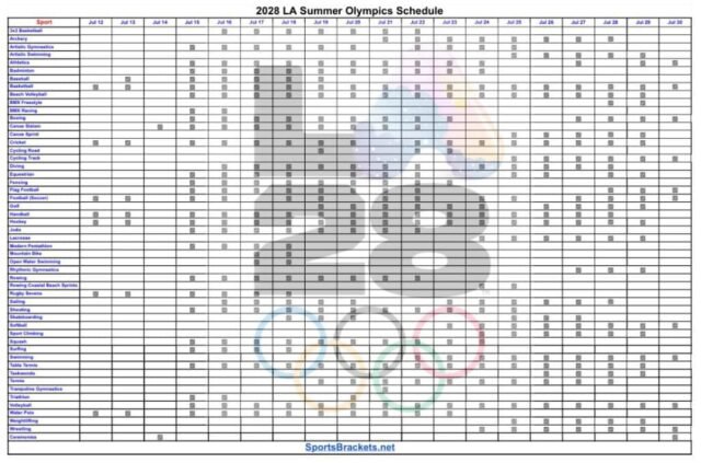 Aquí está el calendario imprimible de los Juegos Olímpicos de Los Ángeles 2028. También puedes descargar un PDF del horario para imprimir. Este.