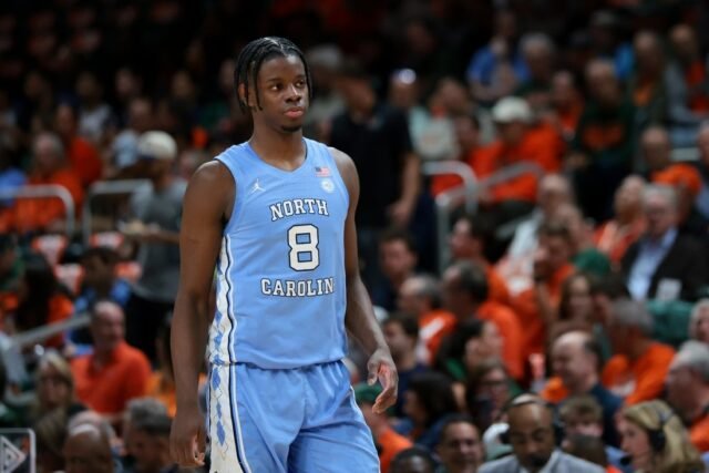 10 de febrero de 2026; Coral Gables, Florida, Estados Unidos; Caleb Wilson (8), delantero de los Tar Heels de Carolina del Norte, observa el partido contra los huracanes de Miami durante la primera mitad en el Watsco Center. Crédito obligatorio: Imagen de Sam Navarro-Imagn