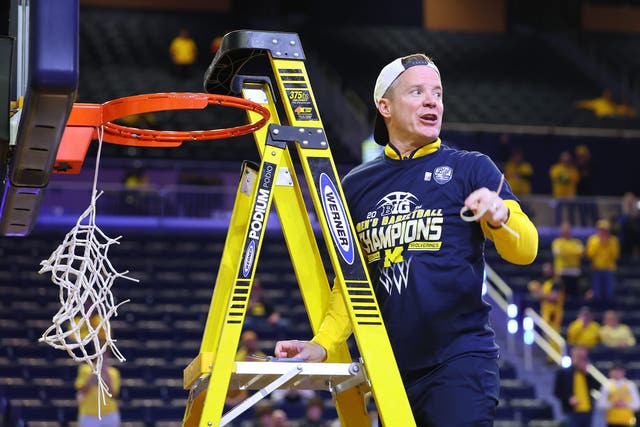 Michigan coach Dusty May cuts down a net after winning the Big Ten regular season title. (Photo by Gregory Shamus/Getty Images)