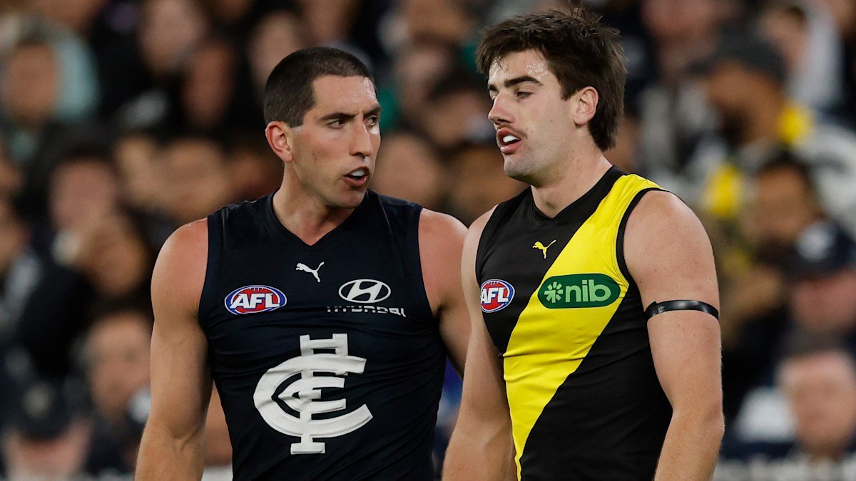 Richmond El joven Jonty Faull fue sancionado con un partido por acción innecesaria tras un disparo desviado de Jacob Weitering durante el partido. por Carlton 10,15 (75) – 9,17 (71) victoria.