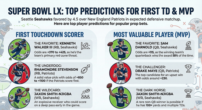 Aquí está nuestro primer touchdown del Super Bowl LX y predicciones del MVP de 2026 para usted. El Super Bowl LX (8 de febrero de 2026, Levi’s Stadium) enfrentó a los Seattle Seahawks contra los New England Patriots en una revancha sorpresa del Super Bowl XLIX. Con Seattle favorecido por 4,5 puntos (línea de dinero ~-230) y un total bajo de 45,5, se espera una batalla defensiva donde las oportunidades de anotar pueden ser limitadas. Los accesorios de los jugadores, como el primer anotador de touchdown y el MVP, agregarán gran emoción.
