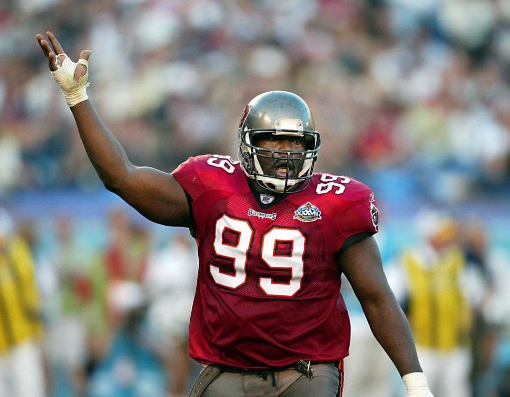 Buccaneers defensive tackle Warren Sapp celebrates a tackle against the Raiders during Super Bowl XXXVII in January 2003. (Timothy A. Clary/AFP via Getty Images)