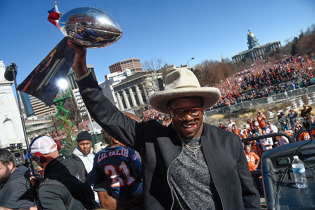 Super Bowl 50 MVP Von Miller holds up the Lombardi Trophy during the Broncos’ victory celebration in February 2016. (Photo By John Leyba/The Denver Post via Getty Images)