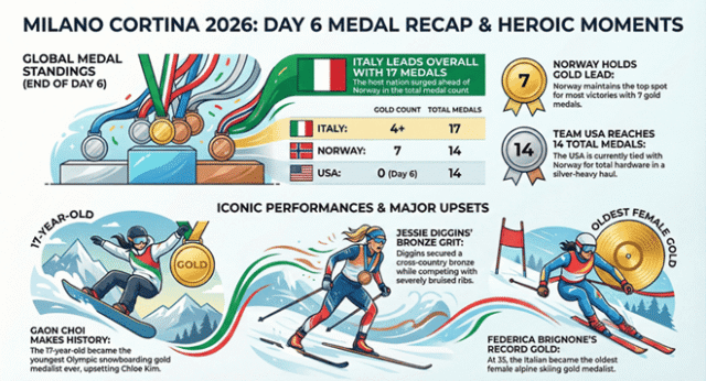 Aquí hay un resumen del día 6 de los Juegos Olímpicos de Invierno de 2026. En los Juegos Olímpicos de Invierno Milán Cortina 2026 de ayer, vimos un gran dramatismo en los nueve eventos de medallas el 12 de febrero, con la anfitriona Italia ascendiendo en la clasificación de medallas y el equipo de EE. UU. agregando hardware clave a pesar de no haber nuevas medallas de oro. Se otorgaron nueve medallas de oro en un ranking que incluía snowboard, esquí de fondo, esquí alpino, patinaje de velocidad, pista corta, trineo, magnates, snowboard de fondo, etc. Italia ganó múltiples medallas (incluidas dos de oro), elevando su total a 17 y superando a Noruega en total. Noruega lidera el oro con una puntuación de 7, mientras que EE.UU. está empatado con Noruega con un total de 14 puntos (peso pesado de plata).