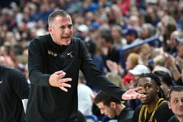 13 de febrero de 2025; Spokane, Washington, Estados Unidos; Chris Gerlufsen, entrenador principal de San Francisco Dons, reacciona después de una jugada en la primera mitad contra los Gonzaga Bulldogs en el McCartthey Athletic Center. Crédito obligatorio: James Snook-Imagn Images