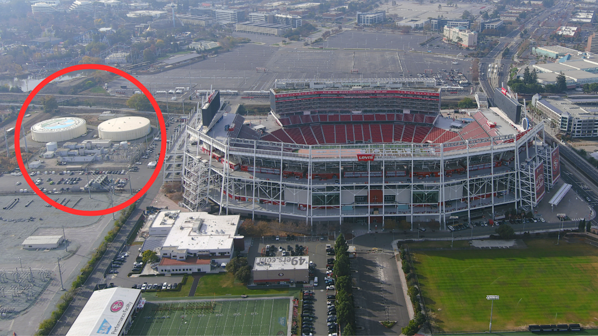 Estadio Levi’s en Santa Clara, con la subestación eléctrica vecina rodeada por un círculo. Getty