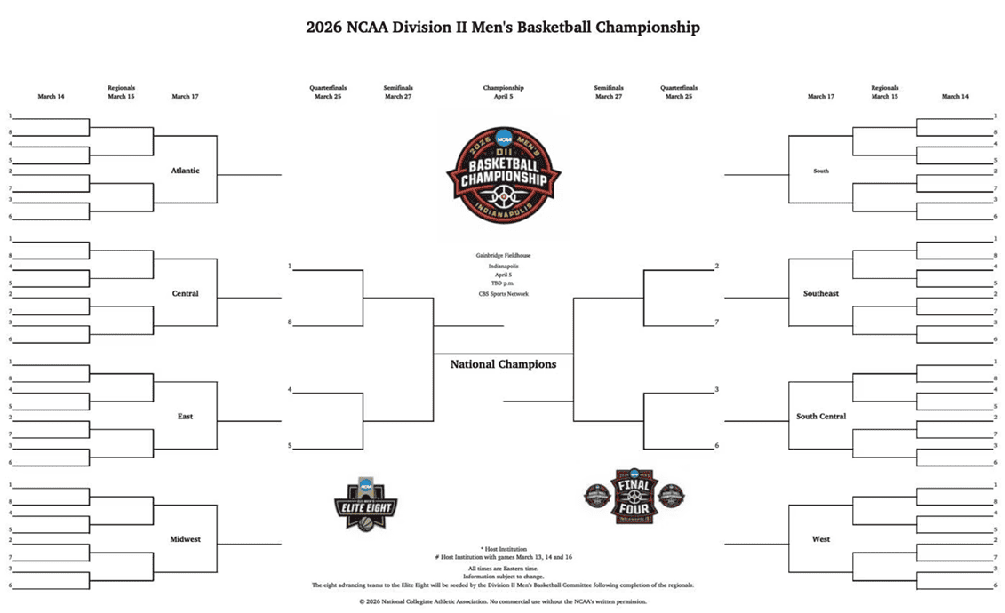 Aquí está el cuadro imprimible del torneo de baloncesto masculino NCAA DII 2026. El actualizado es publicar aquí por la NCAA.