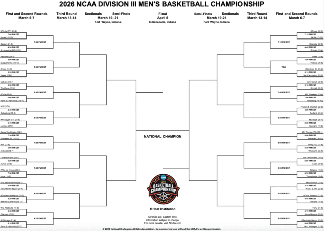 Aquí está el cuadro imprimible del torneo de baloncesto masculino de la División III de la NCAA de 2026. También puede descargar la última versión actualizada desde La NCAA está aquí.