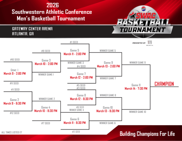 el Torneo de baloncesto masculino SWAC 2026 El calendario está configurado para ofrecer acción HBCU de alto riesgo, ganar el campeonato de la Southwestern Athletic Conference y asegurar una oferta automática para el Torneo de baloncesto masculino de la División I de la NCAA. El torneo se desarrolla desde 9-14 de marzo de 2026en Estadio Central Gateway en College Park, Georgia (cerca de Atlanta). Todos los juegos se transmitirán en la plataforma ESPN+, y es probable que algunas rondas posteriores se transmitan en redes ESPN de nivel superior, como ESPN o ESPN2.