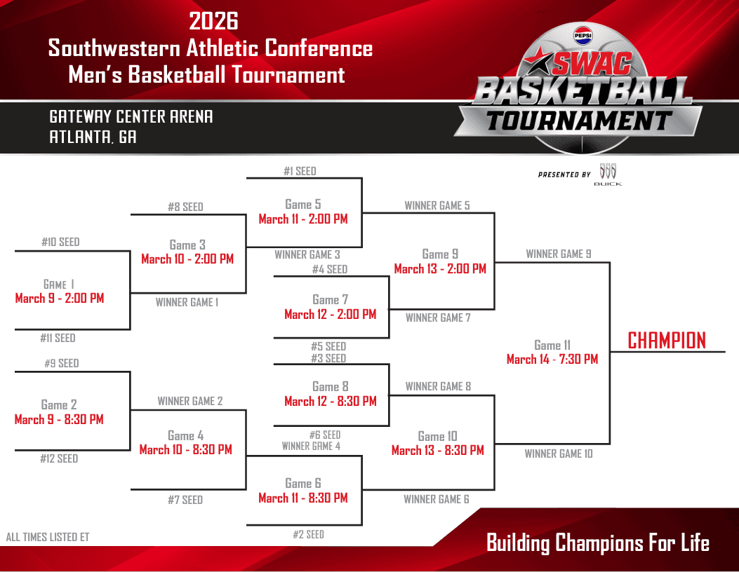 2026 Calendario de baloncesto masculino SWAC utiliza un formato estándar de eliminación simple con rondas preliminares para los clasificados más bajos (normalmente 7-12). La hora es del este (ET) y ajustable; El programa se transmite principalmente por ESPN+.