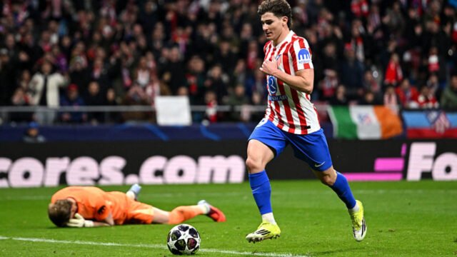 Julián Álvarez, del Atlético de Madrid, anotó el tercer gol de su equipo mientras Antonin Kinsky yacía abatido. Getty