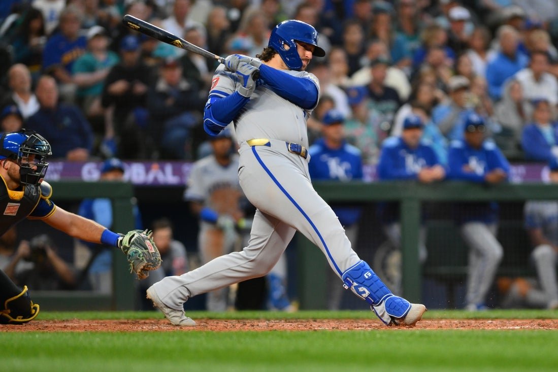 3 de julio de 2025; Seattle, Washington, EE. UU.; El primer basurero de los Reales de Kansas City, Vinnie Pasquantino (9), conectó un sencillo de 2 RBI contra los Marineros de Seattle en la séptima mitad en T-Mobile Park. Crédito obligatorio: Imagen Steven Bisig-Imagn