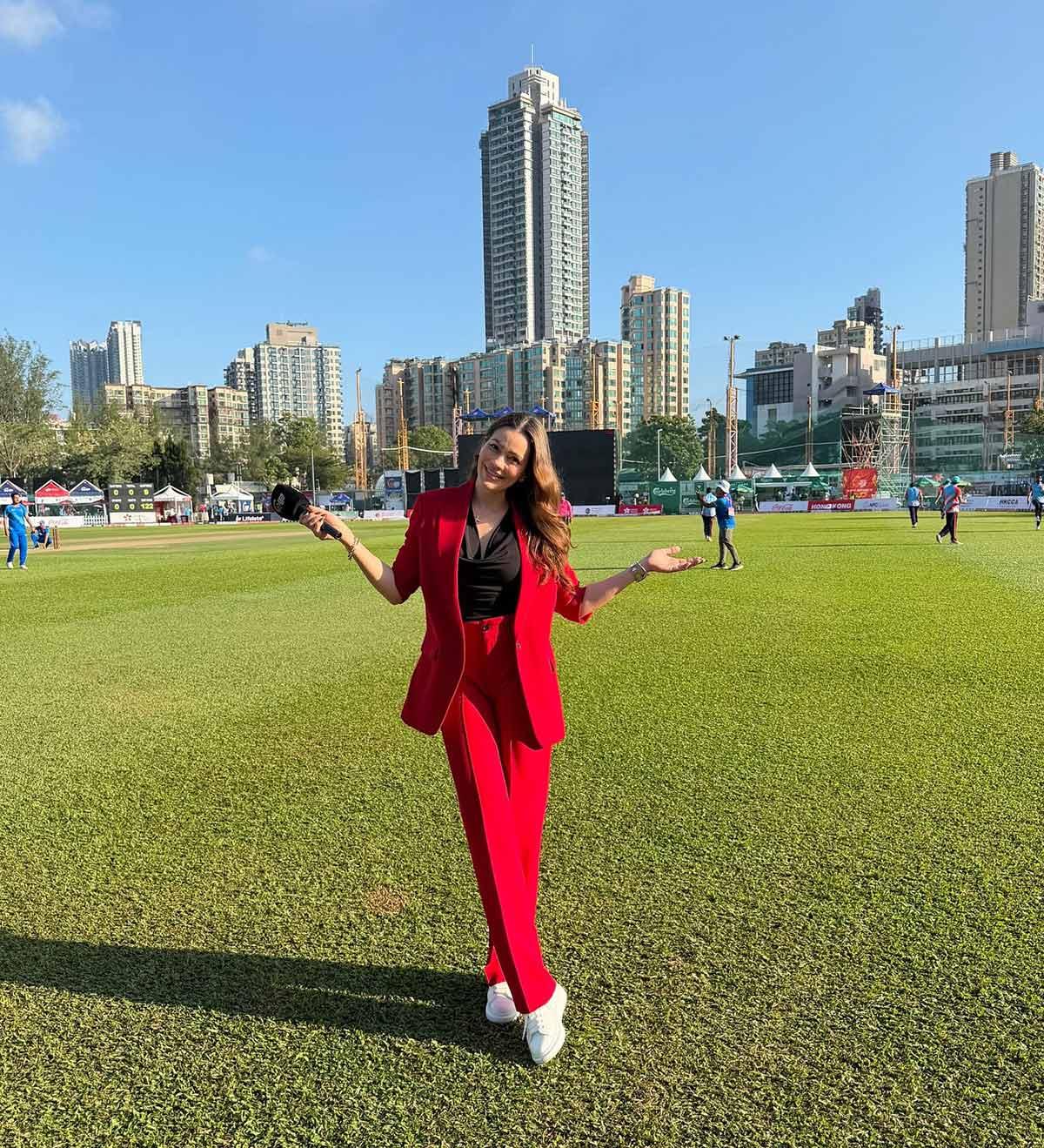 Walucha de Sousa Anclando un evento de cricket en Hong Kong.