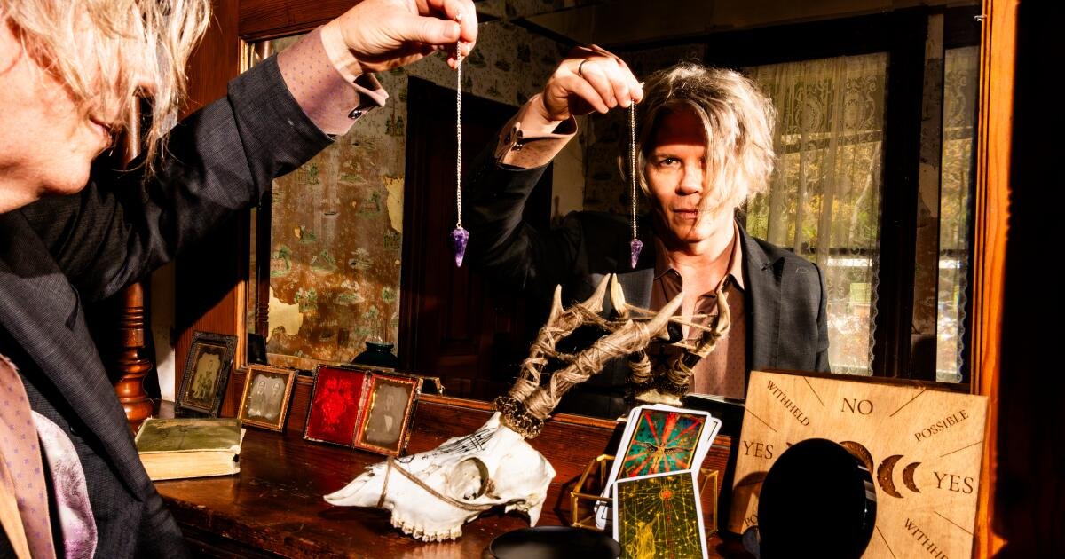 Estoy sentado en una carpa colocada dentro de la sala de la era victoriana. Tengo una tabla de espíritu antes, una tarjeta de terrotas en solitario y un espejo de proyección negra. Estoy aquí para contactar a los muertos.