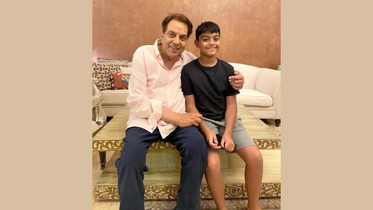 Imagen: Yug, el hijo de Kajol y Ajay Devgn, con Dharmendra. Foto: Cortesía de Kajal/Instagram