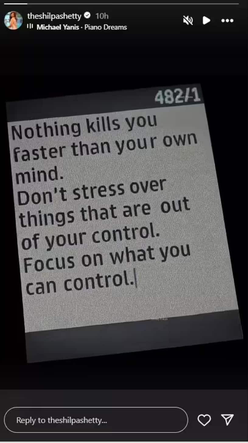 Shilpa Shetty compartió recientemente una publicación críptica en su historia de Instagram, diciendo algo sobre el estrés que sonó como una advertencia. Estos días, ha obtenido Rs. Caso de fraude de 60 millones de rupias. En su publicación, una vez más animó a las personas a centrarse en la paz interior y el bienestar mental.