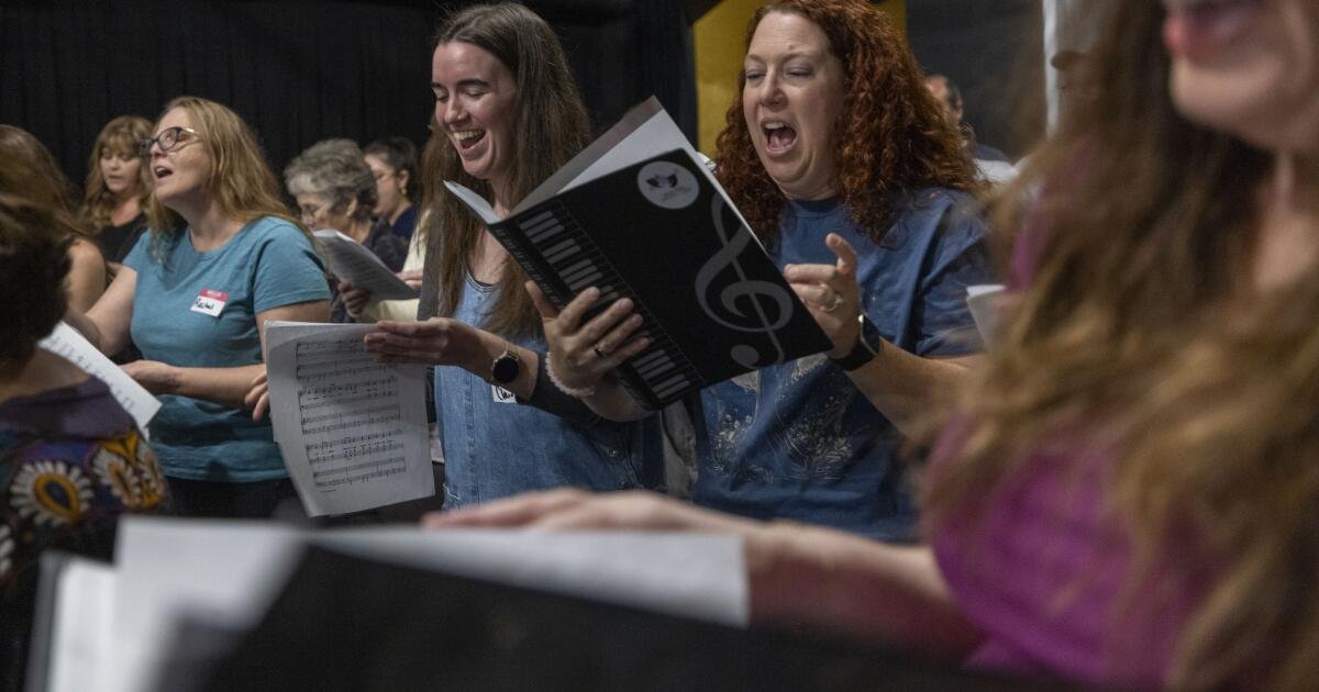 Adam MacDonald hace preguntas serias. Se para frente a un teclado Yamaha, frente a más de dos docenas de adultos inscritos en la clase de los lunes por la noche “Playhouse Singers” en el histórico Pasadena Playhouse. El grupo se prepara para una presentación de elementos básicos del teatro musical, incluido “A Grand Night for Singing” de Rodgers y Hammerstein con letra del musical “State Fair”, “El mundo está brillando y, para agregar al espectáculo, creo que estoy enamorado”.