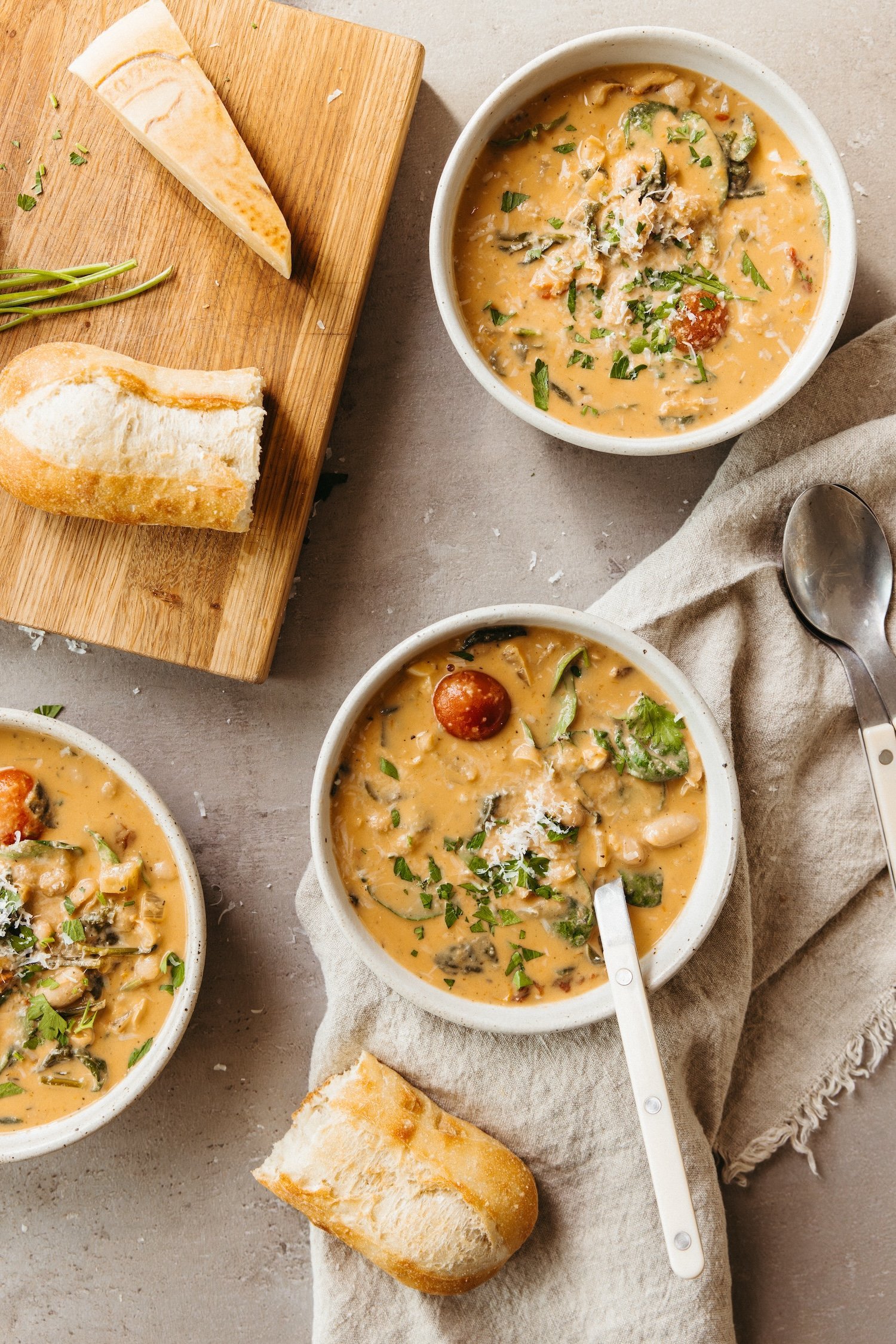 Un tazón de estos tomates asados y sopa de frijoles blancos se asemeja a un abrazo cálido y cómodo cuando tienes un día largo. Los tomates cherry brillantes, los frijoles cremosos y las espinacas disueltas se combinan para dar un sabor delicioso con el voltaje mínimo.