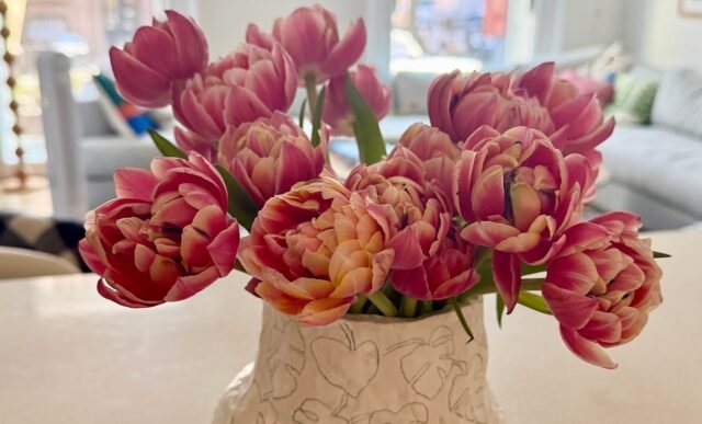 Como Gemma siempre sabe lo que es mejor, salió, rompió el hielo y recogió rosas rosadas (en la foto de arriba) de la tienda. Desde entonces ha florecido maravillosamente y luce muy alegre en la mesa de la cocina.