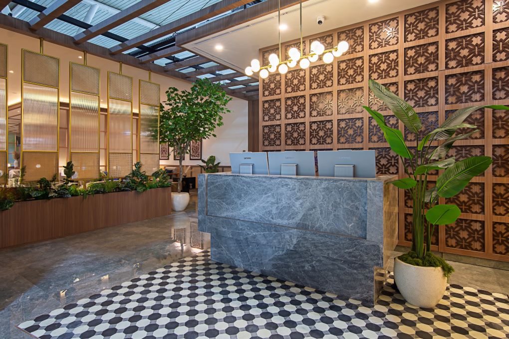 Combinando tonos tradicionales occidentales y maderas cálidas con elementos de diseño indonesio, el espacio presenta batik enmarcado que simboliza la resistencia de Kota Pahlawan.