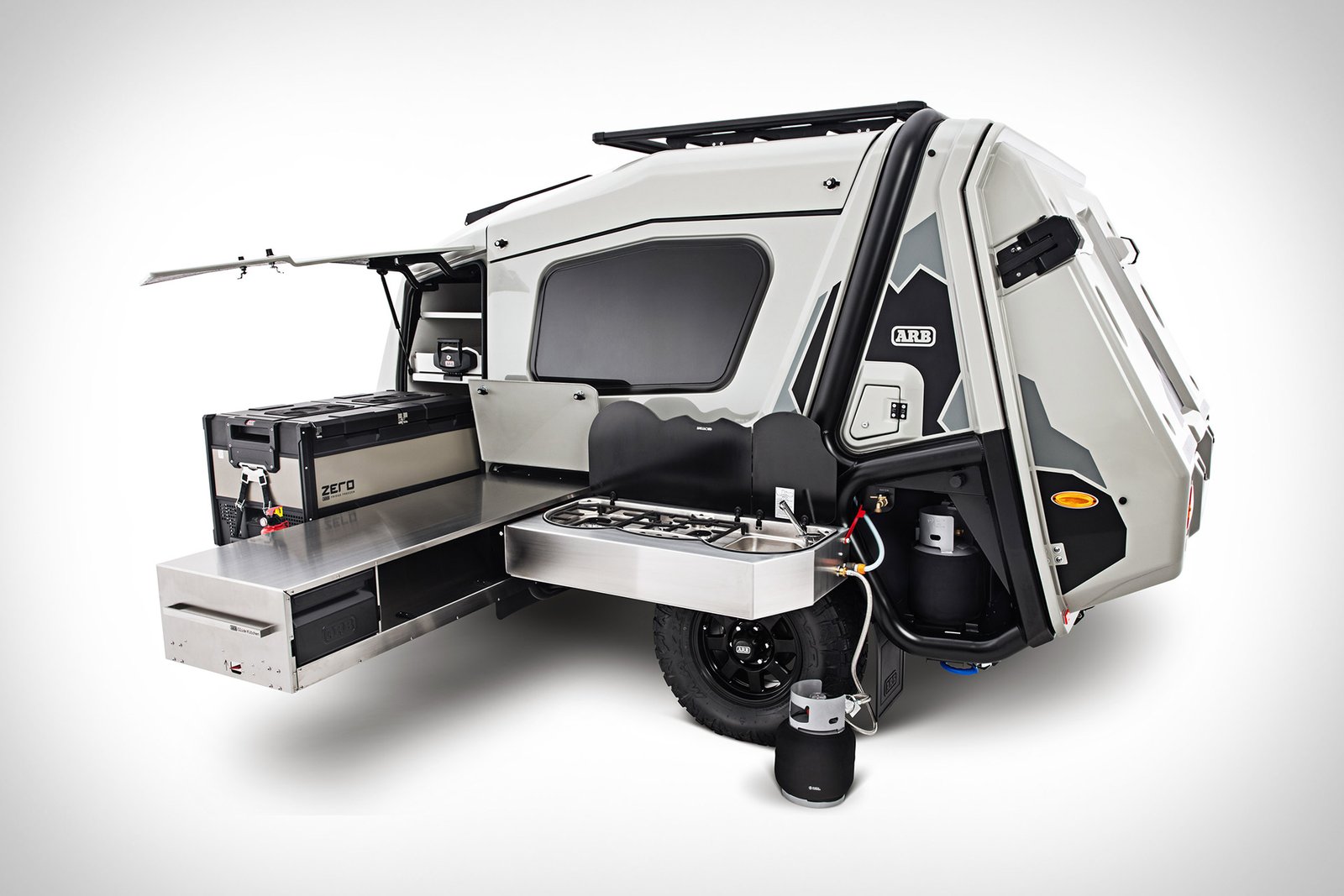 ARB, con sede en Australia, traerá el Earth Camper a Estados Unidos por primera vez. Está construido sobre una estructura de acero con neumáticos todoterreno y amortiguadores para soportar el viaje a cualquier destino remoto. Su exterior duradero está hecho de fibra de vidrio reforzada, lo que proporciona una cubierta resistente y un aislamiento mejorado. A pesar de su pequeño tamaño, el remolque está repleto de comodidades gracias a la experiencia terrestre de la marca. Su área para dormir ofrece una cama tamaño queen, mientras que el respaldo tipo almeja se abre para erigir un dosel independiente, casi duplicando el espacio interior. A un lado hay una cocina exterior de tamaño completo que cuenta con una estufa de tres quemadores, encimeras de acero inoxidable, cajones de almacenamiento y un refrigerador. En el techo, paneles solares de 120 vatios y una batería de litio de 100 amperios respaldan las aventuras fuera de la red.