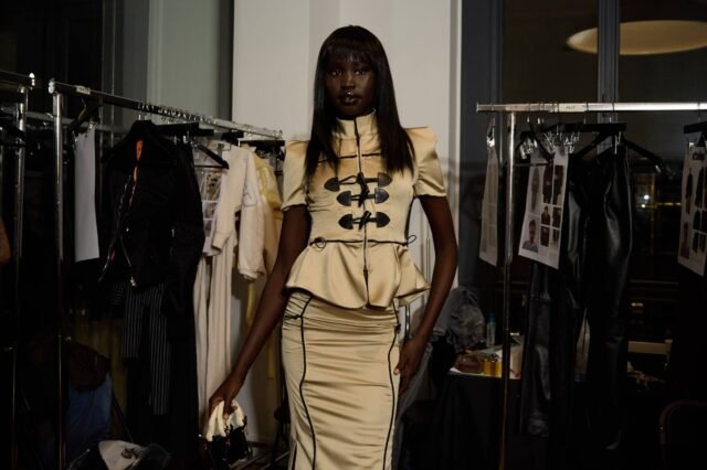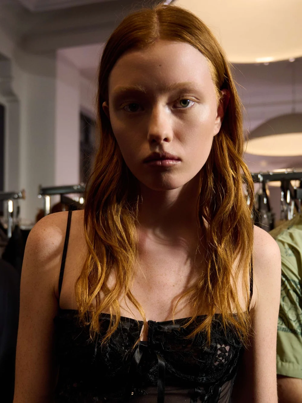 El espectáculo se hizo cargo de una de las oficinas recientemente desocupadas de Ami en París. El espacio estaba completamente a oscuras, excepto por una ventana abierta que daba a la Plaza de la Victoria. Berlín se encuentra con París. Gran encuentro de Raw. Los invitados se sentaron sobre tablas de madera sobre bloques de hormigón, cerca del suelo, cerca de algo honesto. La ropa hizo lo mismo. Las chaquetas y chaquetas de motociclista llegaron con cortes elegantes y precisos. Los pantalones de talle bajo definían la cintura con encaje en el espacio entre la tela y la piel. Telas a rayas en blusas con lazo y minivestidos. El terciopelo athleisure ha regresado, esta vez en forma de falda plisada. La ropa pasó de gabardinas a chaquetas de piel sintética y vestidos de satén.