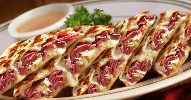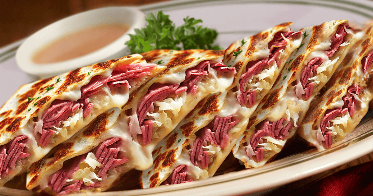 Quesadillas Blarney Blast™ – Carne tierna, chucrut picante y queso suizo derretido envuelto en una tortilla de harina, untado con mantequilla de ajo y asado hasta que esté dorado. Servido con salsa Mil Islas.