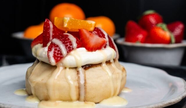 • Mimosa Mocktail Roll: un rollo de canela inspirado en un cóctel sin alcohol de mimosa cubierto con un glaseado de mimosa de ensueño, adornado con fresas frescas y terminado con una llovizna brillante de estilo mimosa cítrica.