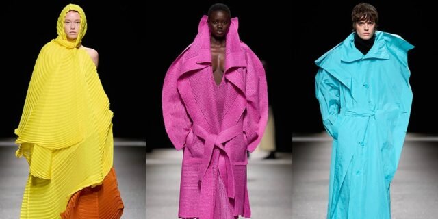 Las gabardinas de gran tamaño brindaron momentos teatrales, combinadas con sombreros de marinero doblados y guantes hasta los hombros. Sus hombros cuadrados, representados en amarillo brillante y azul, crearon una tensión entre estructura y fluidez. Los textiles tejidos de color rosa llegaban al escote y ceñían la cintura con un dobladillo ligeramente desgastado, mientras que los pliegues característicos de la marca se extendían por la pasarela en ráfagas de amarillo, naranja y morado.