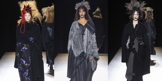 Finalmente, cinco modelos salieron llenas de tradición, vistiendo elaboradas prendas de punto y zapatos geta de madera que rara vez se ven fuera de entornos ceremoniales. Cabello altísimo y capas delicadas definieron los momentos finales, cuando Yamamoto hizo su reverencia final ante una multitud estridente que se inclinó una vez más ante el maestro.