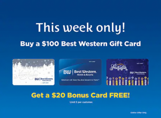 Best Western está de regreso con su oferta anual de Acción de Gracias, Black Friday, Cyber Monday y Just Beyond Gift Card. Hasta el 5 de diciembre, puede obtener $20 en tarjetas de bonificación gratis al comprar $100 en tarjetas de regalo Best Western. Pero cuidado: las tarjetas de recompensas caducan en unos meses.